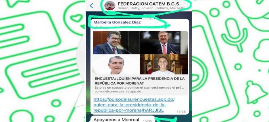 La líder estatal de la organización en Baja California Sur, Marbella González en el grupo de whatsapp denominado “Federación Catem BCS” dio “línea” para apoyar al legislador federal, Ricardo Monreal.
