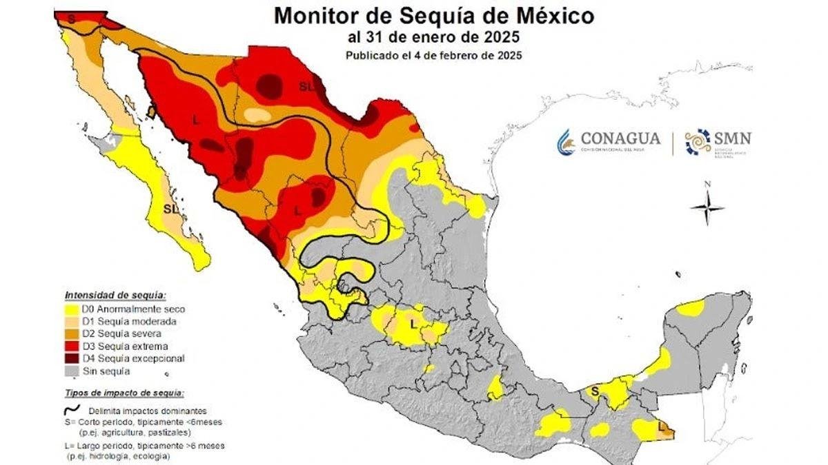 Durante la segunda quincena de enero de 2025, se registraron tres frentes fríos y eventos de «Norte» que dejaron lluvias en el sur y sureste del país, sin embargo, la mayor parte del territorio presentó precipitaciones por debajo del promedio, lo que contribuyó al incremento de áreas con sequía moderada a extrema en Baja California, Sonora, Chihuahua, Coahuila, Durango y Sinaloa.