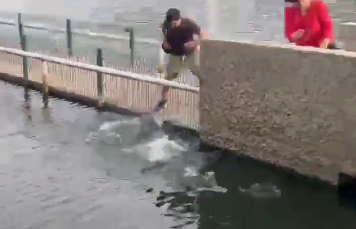 El momento quedó grabado por un espectador, cuyas imágenes ya circulan en redes sociales y se observa el momento en el que un sujeto se asoma por el barandal de metal que divide la laguna del mirador del parque.